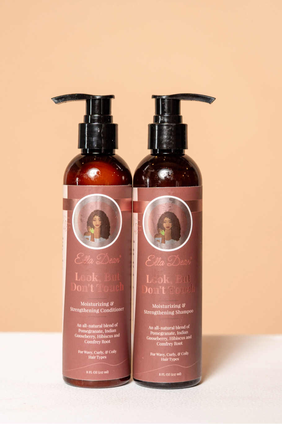 Follow with the matching Look, But Don’t Touch Moisturizing & Strengthening Conditioner, which replenishes moisture, softens dry curls, and reduces shedding. These two together create the foundation for long-lasting hydration.
